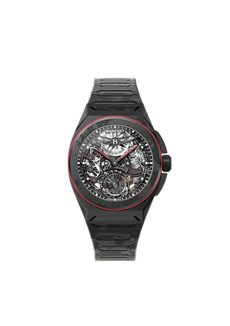 Within its 39 mm case sits an in-house automatic flying tourbillon at 8.9 mm in height, rated to 10 ATM and 5,000G of shock resistance. Each component is visible through the open-worked dial.